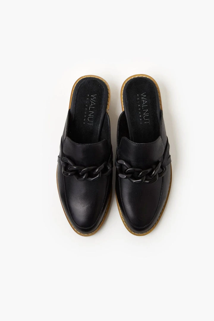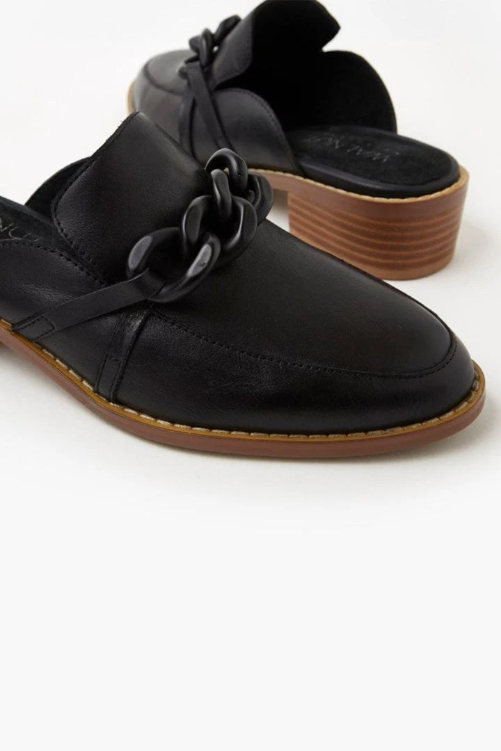 The Gabriel mule is a perfect all-year-round slip on mule with a mid-low block heel for ultimate comfort. Featuring on-trend matt black chain link, wear with wide leg cropped pants for a casual but polished look.